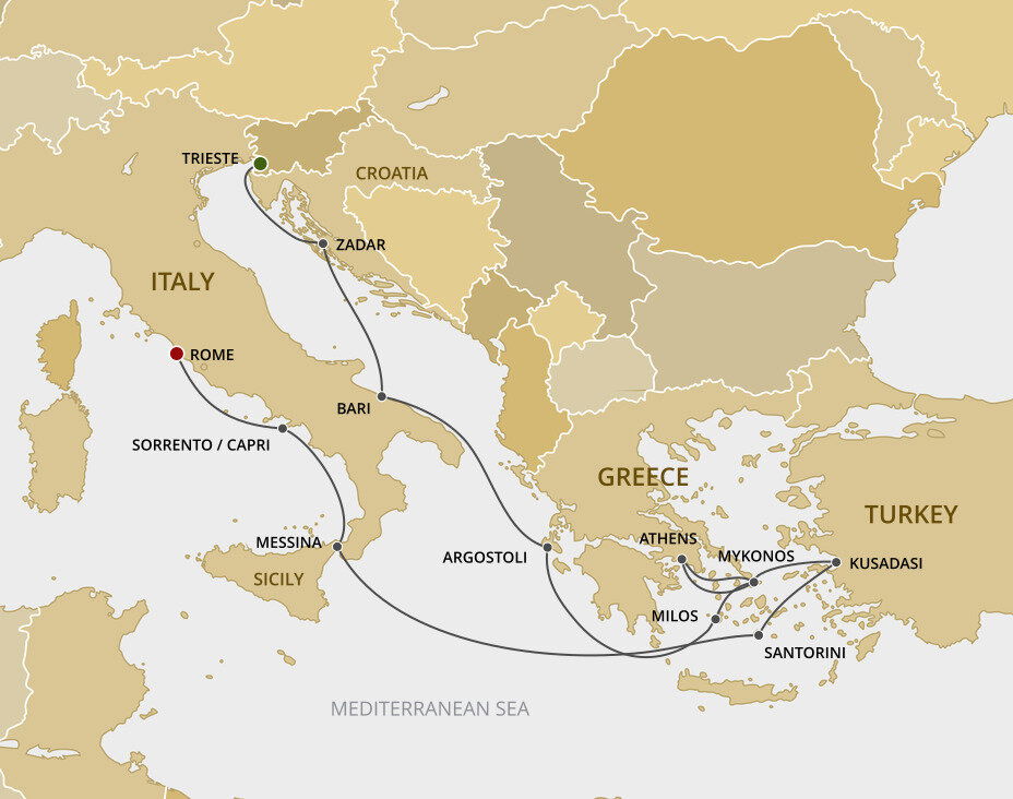 Sorrento's colourful, sun-faded facades cascade down from green hills and cliffs to the Bay of Naples. Looking out from Sorrento, in the Gulf of Naples, is the isle of Capri. Well known for its sparkling Blue Grotto and as the playground of the rich and famous. Ships will anchor offshore and tenders will be provided to the marina.