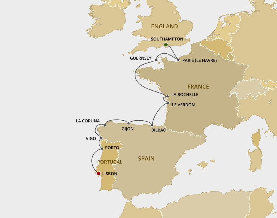 Surrounded by green mountains and lined by the beautiful blue water of the Bay of Biscay, Bilbao is magnificent mix of historic and spectacular modern architecture. Famed for its Guggenheim Museum, clad in glimmering titanium, this enormous structure is a work of art itself. Ships will dock in Getxo, which is a 20 minute drive from Bilbao.