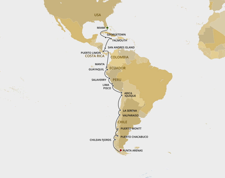 Salaverry is the gateway to Trujillo, an elegant colonial town with brightly coloured façades, decorated with ornate wooden balconies. The city has a splendid backdrop of the Andean foothills and is set in a land scattered with impressive ruins and archaeological treasures left by ancient civilisations. Ships will dock at this port.
