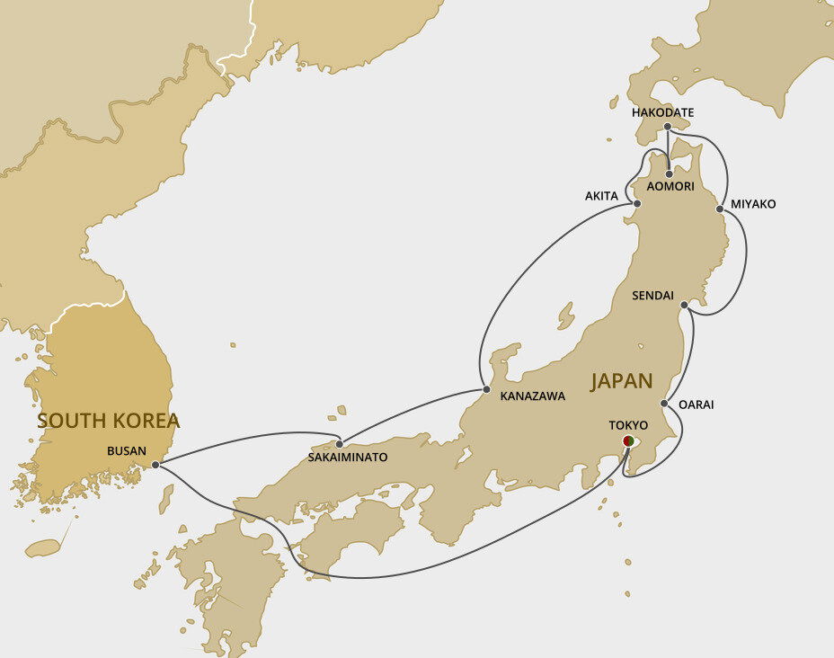 Akita is the capital of Akita Prefecture, which is renowned for Akita dogs, high-quality rice and sake, and lively folk festivals. Among the area's main attractions are its natural beauty of mountains and the sea, hot springs and the town of Kakunodate, which preserves one of Japan's most interesting samurai districts. Ships will dock at the Akita Port Cruise Terminal.
