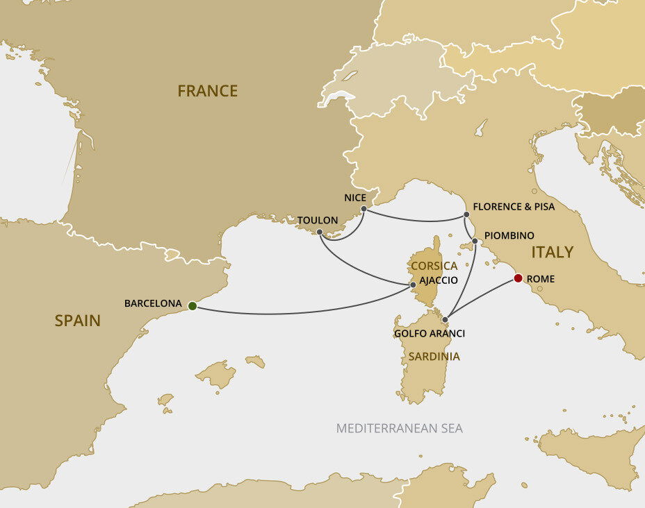 Located on the west coast of Corsica, Ajaccio is surrounded by green-hued mountains, with shady palm fringed squares and pleasure boats bobbing in the bay. The city is best known as the birthplace of Napoleon Bonaparte and his legacy dominates the city in its statues and street names. Ships will dock at Gare Maritime d’Ajaccio.