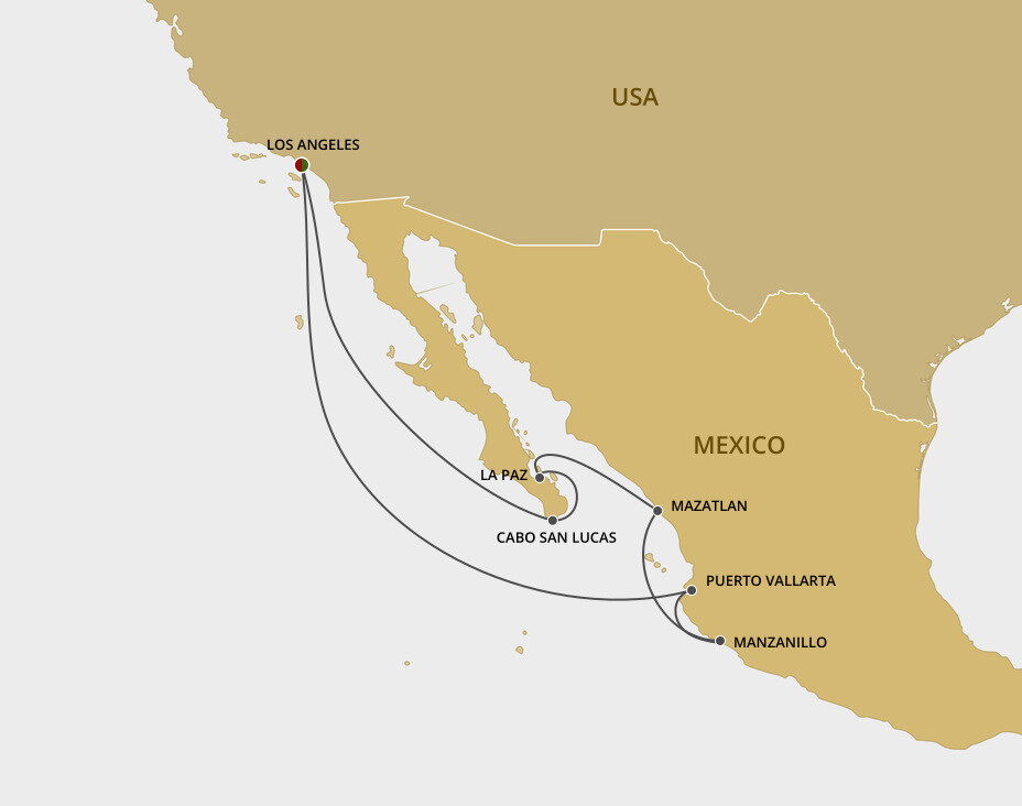 Cabo San Lucas is the sunny resort town on the tip of Mexico’s Baja California. This colourful small town is known for its excellent big-game fishing, great diving spots and challenging surf waves. Ships will anchor offshore in Cabo San Lucas bay and tender guests to shore.