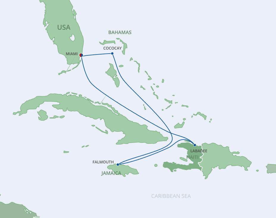 Labadee lies on the north coast of Hispaniola, with a backdrop of lush jungle-covered mountains that fall into the turquoise blue waters. A tucked-away paradise, where pristine beaches, frozen cocktails, and sparkling blue waters await. Ships will dock at the pier.
