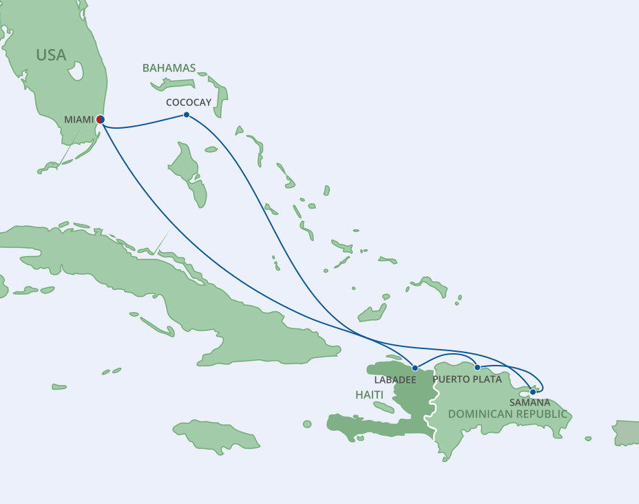Labadee lies on the north coast of Hispaniola, with a backdrop of lush jungle-covered mountains that fall into the turquoise blue waters. A tucked-away paradise, where pristine beaches, frozen cocktails, and sparkling blue waters await. Ships will dock at the pier.