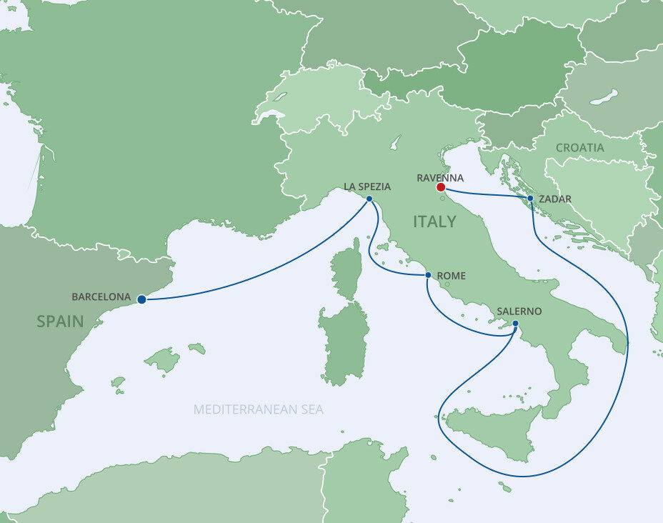 The lively seaport of Salerno is a thriving modern metropolis with ancient origins. Its elegant lungomare, a shoreside promenade, offers far-reaching views of the sea and the mountains beyond. The city boasts an ideal location with both the ruins of Roman cities and the stunning Amalfi Coast in easy reach. Ships will dock at this port.