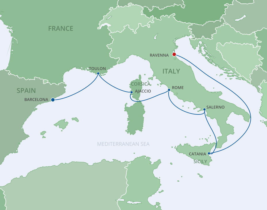 The lively seaport of Salerno is a thriving modern metropolis with ancient origins. Its elegant lungomare, a shoreside promenade, offers far-reaching views of the sea and the mountains beyond. The city boasts an ideal location with both the ruins of Roman cities and the stunning Amalfi Coast in easy reach. Ships will dock at this port.