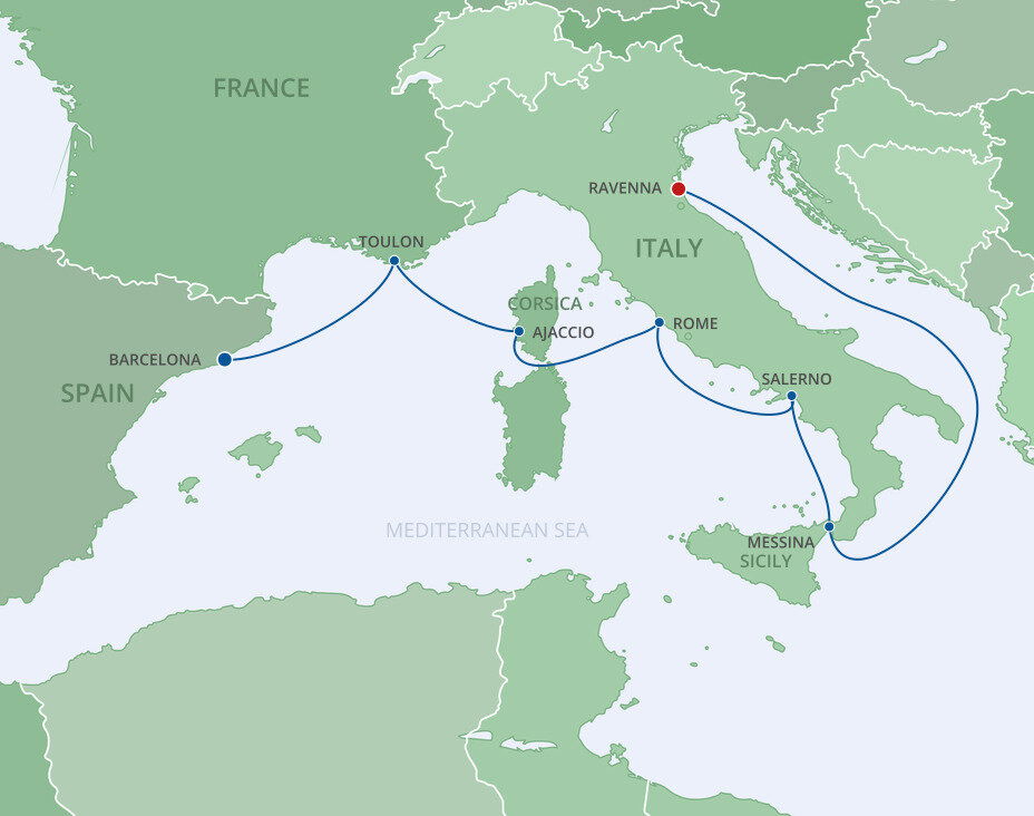 Messina is located on the northeastern corner of Sicily and is the panoramic gateway to the island. Sitting on a sickle-shaped harbour and under the gaze of Mt. Etna, the city is a patchwork of churches and antique palaces. Ships will dock at the cruise terminal.