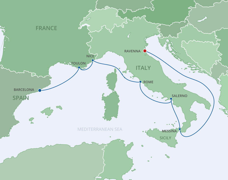 Messina is located on the northeastern corner of Sicily and is the panoramic gateway to the island. Sitting on a sickle-shaped harbour and under the gaze of Mt. Etna, the city is a patchwork of churches and antique palaces. Ships will dock at the cruise terminal.
