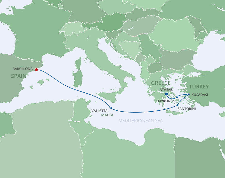 Your cruise finishes today in Barcelona, a captivating city on Spain's northeastern coast. If you're extending your stay in the city, start with a visit to La Sagrada Família, Antoni Gaudí's masterpiece, then wander through the narrow, historic streets of the Gothic Quarter.