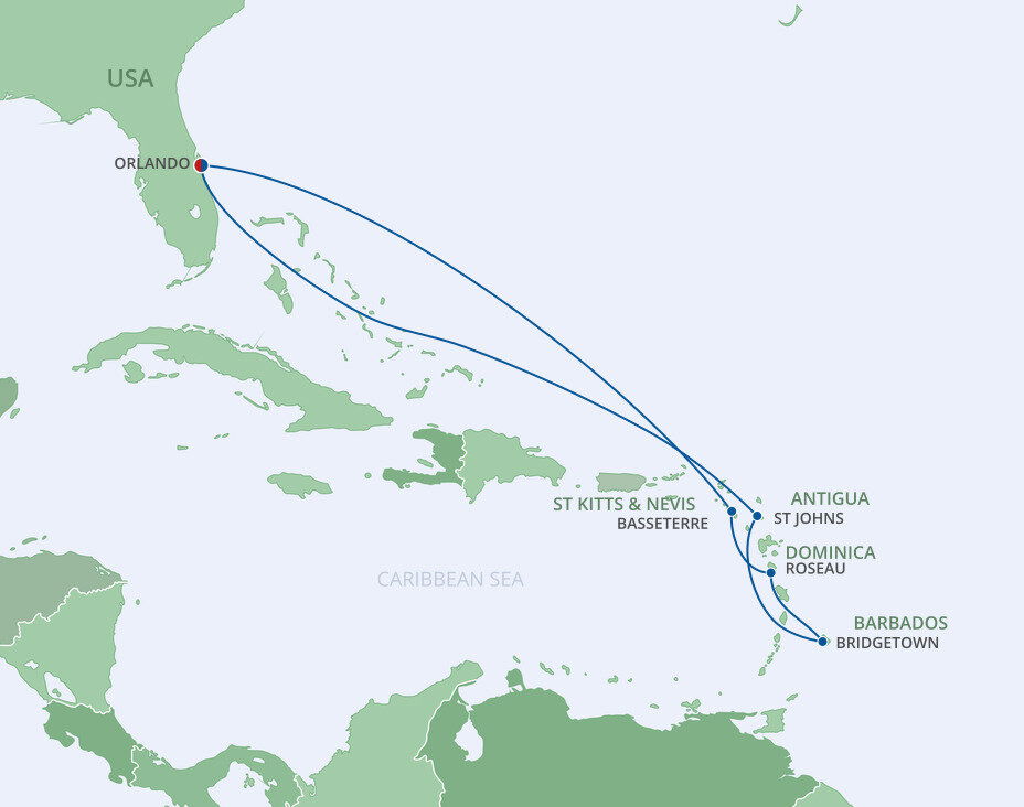 Antigua has a beach for every day of the year— literally. But the island experience goes beyond 365 distinct ribbons of white sand and clear waters. In the capital city of St. John's, you’ll discover charming candy-colored architecture, lively markets, and a beautiful baroque cathedral. And smiling locals greet you everywhere you go. On the southern coast, you can explore Nelson’s Dockyard, a centuries-old British naval base built by Admiral Horatio Nelson. Past Antigua’s yacht-studded coastline, you’ll find upscale boutiques, wild forest trails, hidden coves, and coral reefs bustling with tropical fish. But the best way to really see the island is from up above, so cruise to Antigua and hop into a helicopter for a panoramic look at lush jungles, golden beaches, and the nearby volcanic island, Montserrat.
