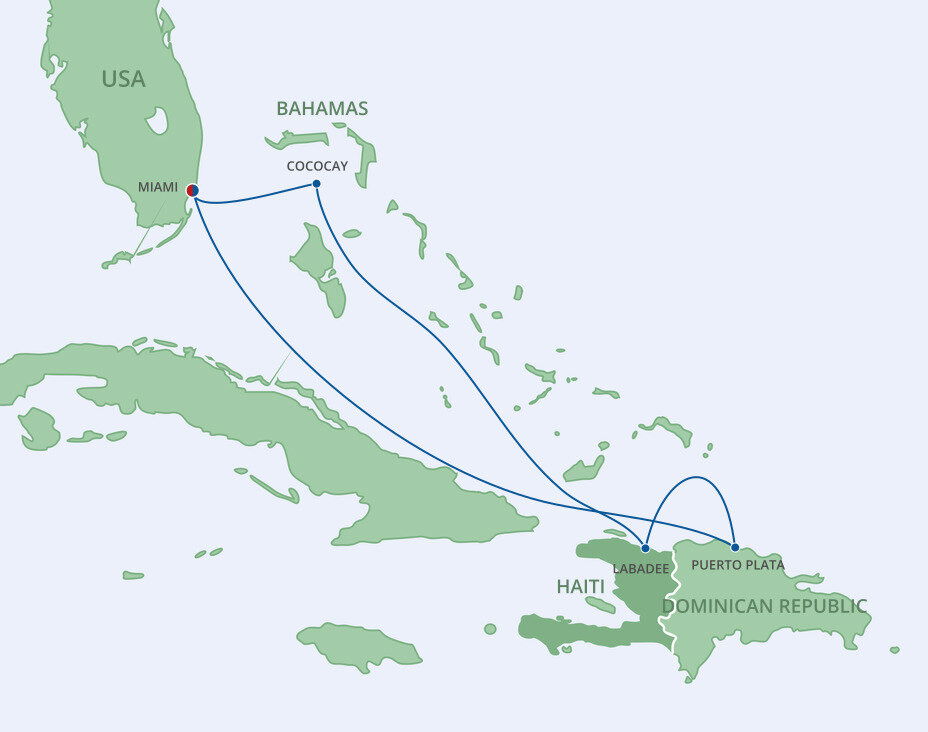 Labadee lies on the north coast of Hispaniola, with a backdrop of lush jungle-covered mountains that fall into the turquoise blue waters. A tucked-away paradise, where pristine beaches, frozen cocktails, and sparkling blue waters await. Ships will dock at the pier.