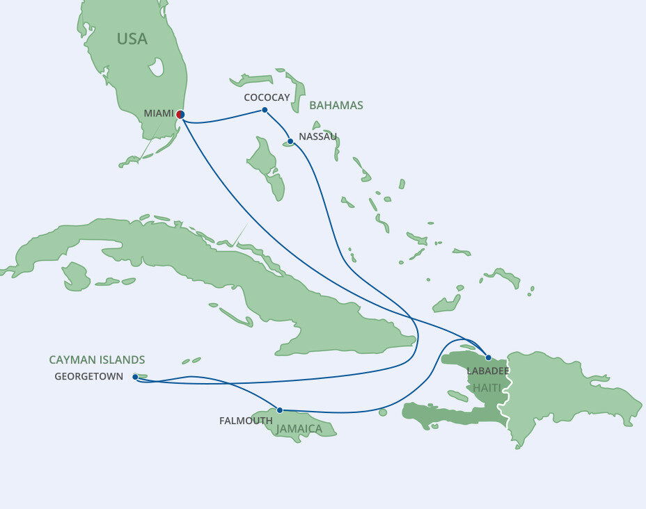 Labadee lies on the north coast of Hispaniola, with a backdrop of lush jungle-covered mountains that fall into the turquoise blue waters. A tucked-away paradise, where pristine beaches, frozen cocktails, and sparkling blue waters await. Ships will dock at the pier.