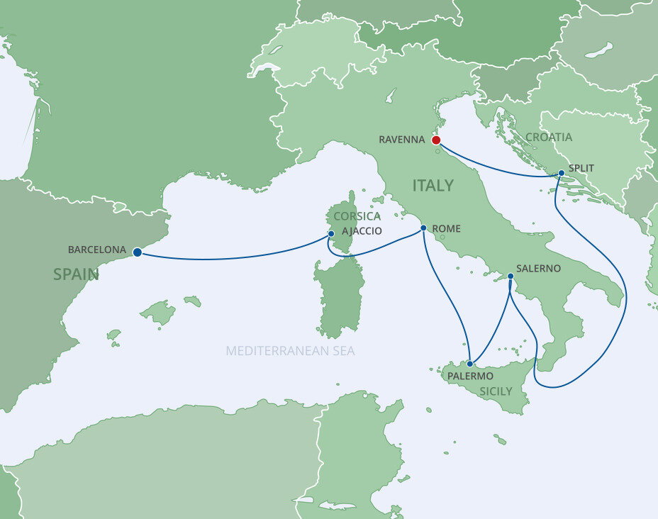 Ravenna, “The Mosaic City”, is best known for its churches which date back 1,500 years and are decorated with stunning Byzantine mosaics. If you're not staying in Ravenna at the end of your cruise, Bologna it's approximately 85 kms (53 miles) away, and Venice is approximately 140 kms (87 miles) away - a journey that takes about 2 hours by train.