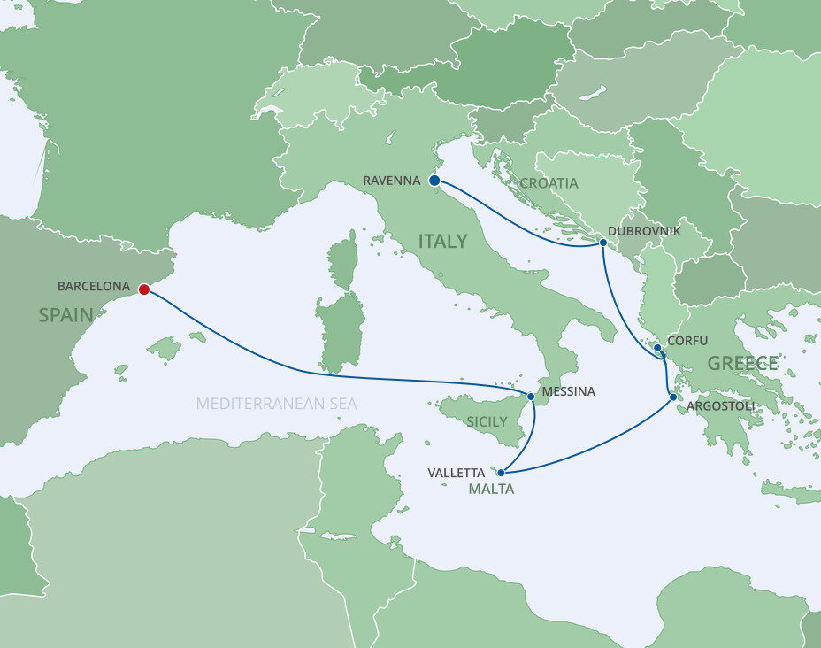 The lush and verdant island of Corfu lies in the Ionian Sea, midway between Greece and Italy. It is an island of sparkling beaches, mountains splashed with wildflowers, and historical, perched fortresses. Ships will dock at the town of Corfu.