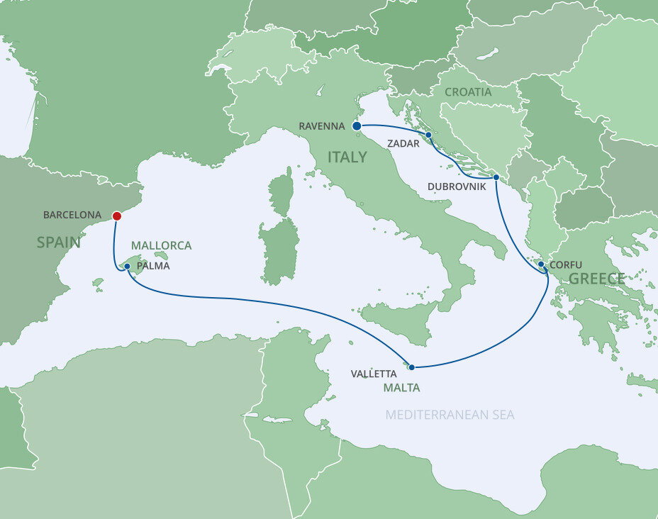 The lush and verdant island of Corfu lies in the Ionian Sea, midway between Greece and Italy. It is an island of sparkling beaches, mountains splashed with wildflowers, and historical, perched fortresses. Ships will dock at the town of Corfu.