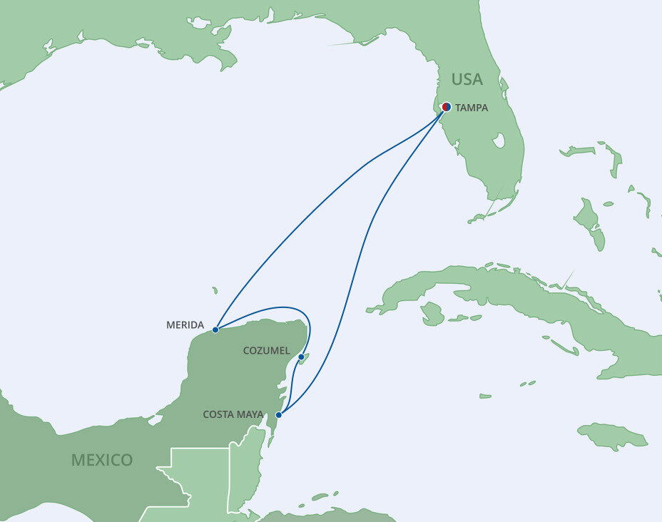 Located on the Yucatan peninsula, Costa Maya is privy to some of the best natural wonders, historic structures, and scenic views in Mexico. Built to predominately cater to cruisers, it offers sandy beaches, coral reefs, Mayan ruins, intriguing animal encounters, and exhilarating activities. Ships will dock at this port.