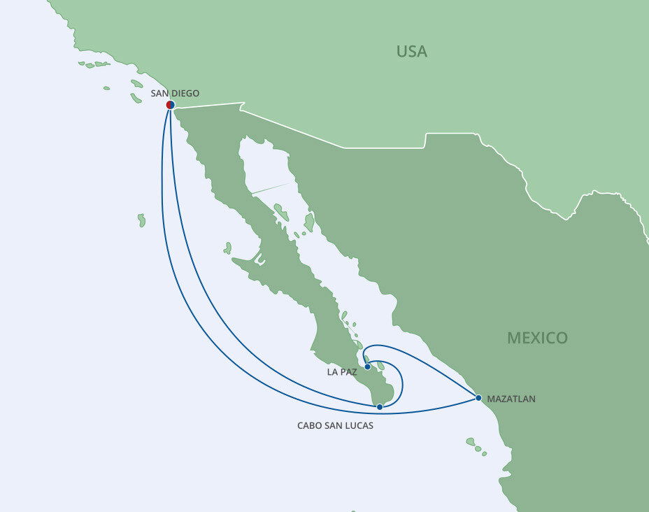 Cabo San Lucas is the sunny resort town on the tip of Mexico’s Baja California. This colourful small town is known for its excellent big-game fishing, great diving spots and challenging surf waves. Ships will anchor offshore in Cabo San Lucas bay and tender guests to shore.