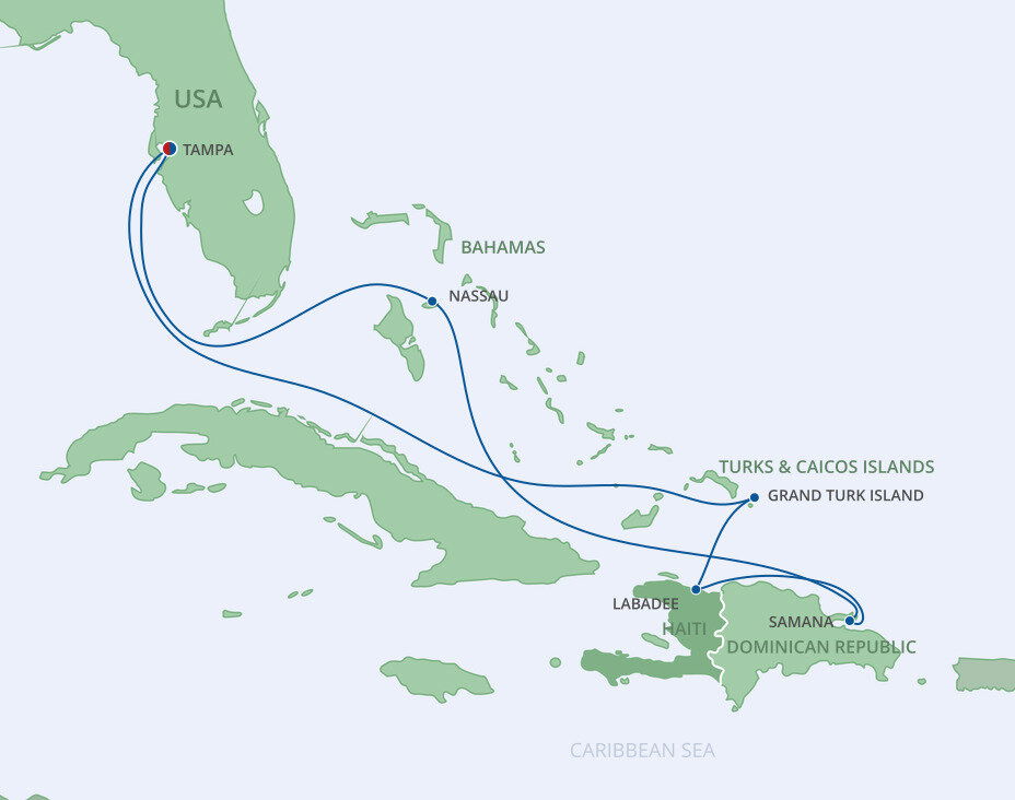 Labadee lies on the north coast of Hispaniola, with a backdrop of lush jungle-covered mountains that fall into the turquoise blue waters. A tucked-away paradise, where pristine beaches, frozen cocktails, and sparkling blue waters await. Ships will dock at the pier.