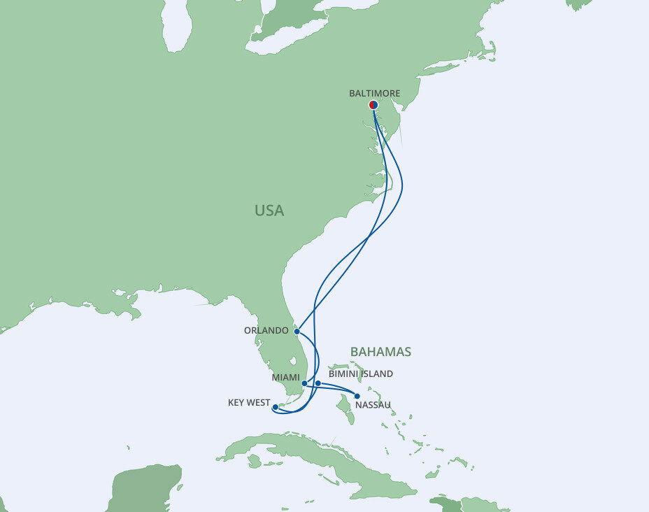 Ships dock at Baltimore’s main cruise port, Cruise Maryland Terminal, which is just a 10-minute drive from Baltimore’s iconic Inner Harbor area.