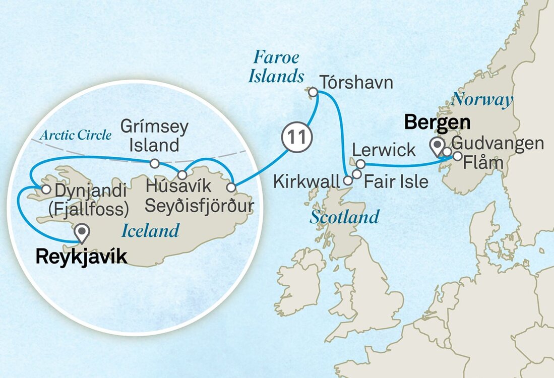 This afternoon you'll arrive at Tórshavn. Named after the Norse god Thor, this is one of the world's smallest capital cities in one of Europe's least travelled destinations. The Faroe Islands offer a captivating blend of Scandinavian culture and breathtaking natural beauty. Wander down cobbled alleyways between colourful buildings with grassy roofs and imagine life in Viking times. Towering cliffs, craggy fjords and powerful waterfalls create a wild landscape. (B/L/D)