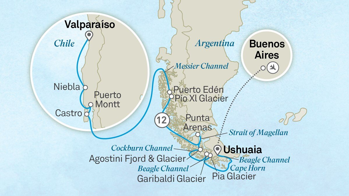 This morning enjoy cruising through Relocavi Sound before arriving in the Chilean Lake District, Puerto Montt. It sits near the end of the Pan-American Highway – this epic stretch of road begins in Alaska and continues to Ushuaia in Argentina. Puerto Montt is the gateway to the Andean Alps and Patagonian fjords; around the corner lie gorges, far-flung islands, snow-capped volcanoes, and windswept shores.