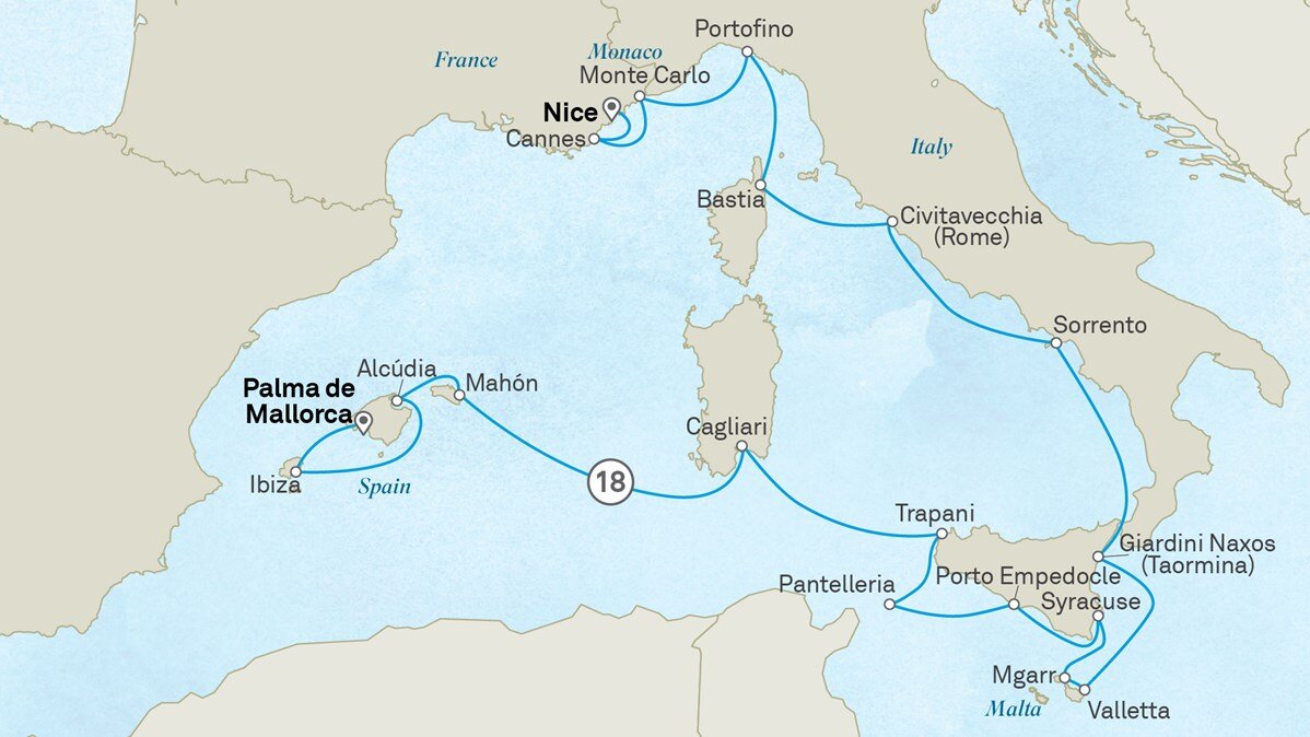 Portofino, with its postcard-perfect scenery and undeniable Mediterranean charm, invites you to embrace la dolce vita. Vibrant, colourful buildings line the shores of crystal-clear waters, framed by lush, pine-covered hills. Thanks to another late departure, you'll have ample time to explore luxury boutiques, take a dip in the turquoise bay, savour impeccably fresh seafood, and spot celebrities at the exclusive bars scattered around the iconic Piazzetta. (B/L/D)