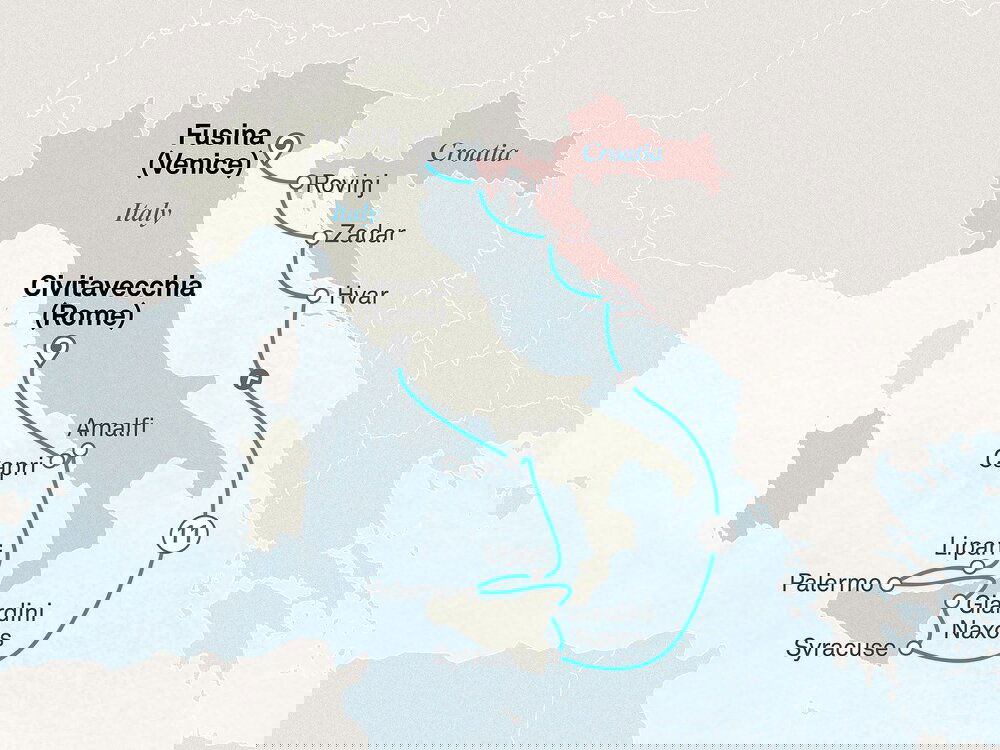 Arrive in Palermo, a vibrant and historic city located on the northern coast of Sicily. The island's capital reveals a mix of cultures, including Italian, Arabic and Norman influences, which is evident in its diverse architectural styles and cuisine. Palermo's historic centre is a World Heritage-listed site, brimming with beautiful churches, palaces and bustling squares. Palermo is also known for its street food scene, with markets like Mercato Ballarò and Mercato Vucciria serving up a wide range of local specialties, such as arancini, panelle, and sfincione.