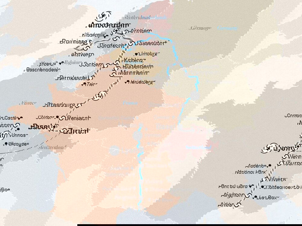 Relax on board this afternoon as you cruise through the picturesque Rhine Gorge, where the landscapes could have been pulled from the pages of a fairytale. This 65-kilometre stretch of the river is dotted with some 40 hilltop castles and fortresses that span a period of 1,000 years. Look out for the Lorelei statue, dedicated to the tragic legend of a beautiful maiden. (B/L/D)