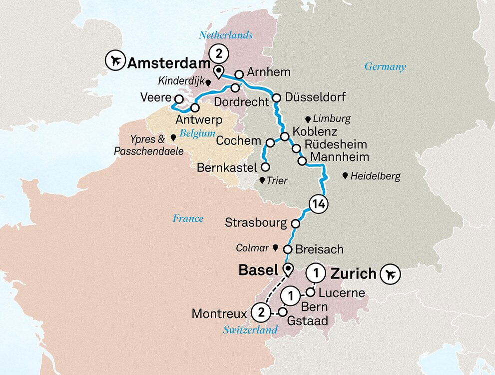 After breakfast depart for Basel. Enroute, stop in the town of Vevey where you can immerse yourself in the world of one of the 20th century's most iconic figures with a stop at Chaplin's World Museum. Explore the home, studio, and park that served as the sanctuary for the legendary comedian, Charlie Chaplin, during his 25 years of residence. Learn about his life, artistry, and lasting impact on the world of film as you take in the rich history and stunning views of the surrounding landscapes. (B/D)