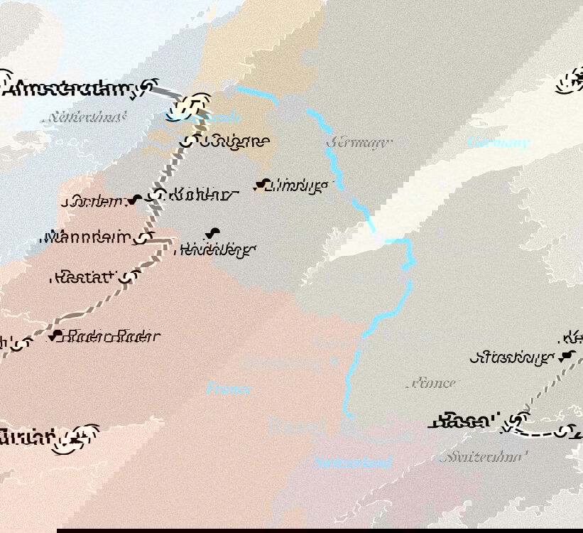 Your cruise finishes this morning in Amsterdam. Savour one final breakfast on board before you disembark, taking with you a lifetime of memories of the wonders and wines of the Rhine.