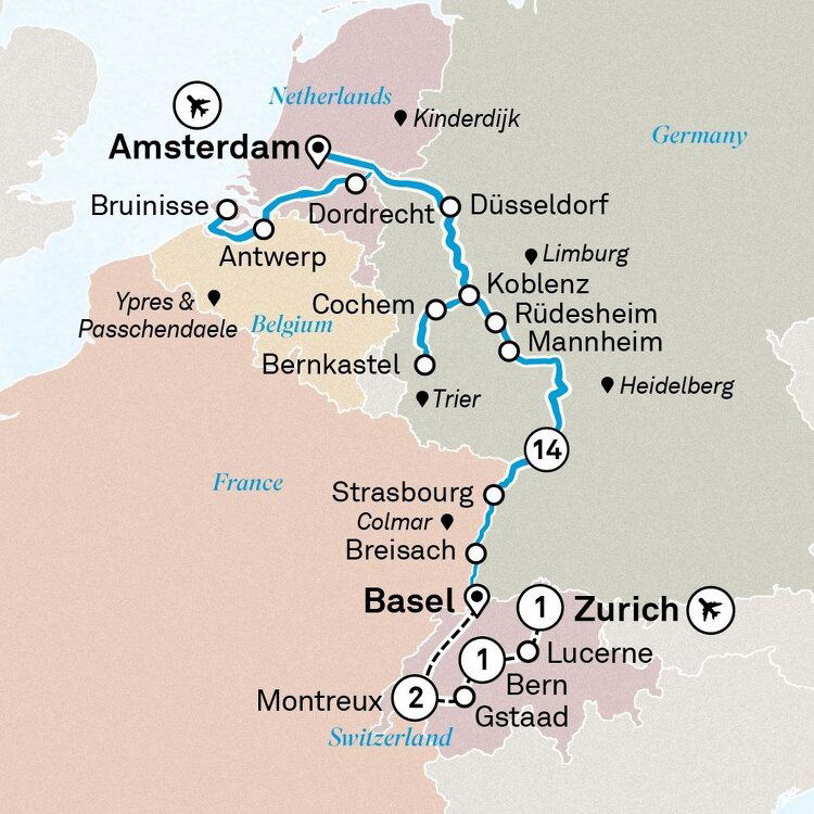Relax on board this afternoon as you cruise through the picturesque Rhine Gorge, where the landscapes could have been pulled from the pages of a fairytale. This 65-kilometre stretch of the river is dotted with some 40 hilltop castles and fortresses that span a period of 1,000 years. Look out for the Lorelei statue, dedicated to the tragic legend of a beautiful maiden. (B/L/D)