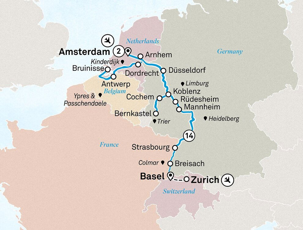 Your cruise concludes this morning in Basel. Enjoy one final breakfast on board, then disembark and transfer to Zurich Airport, taking with you lifelong memories of a remarkable journey across a continent.