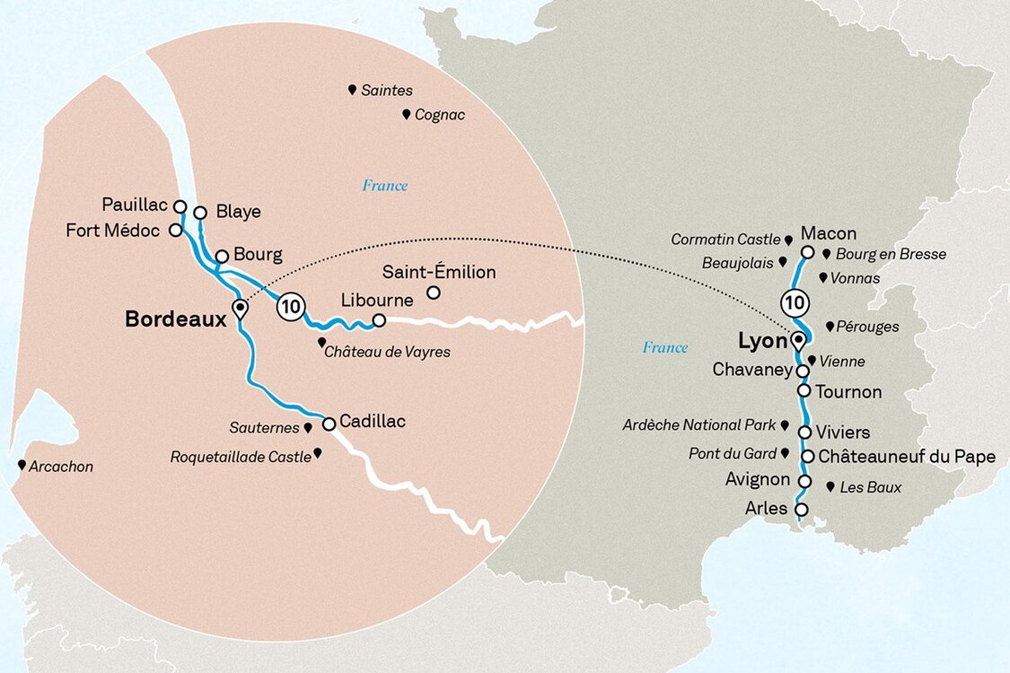 Please note: The Gironde, Dordogne and Garonne waterways are part of a tidal river system which results in changing water levels in the region. Every effort is made to keep to the brochure itinerary however based on tides it will be amended or modified.