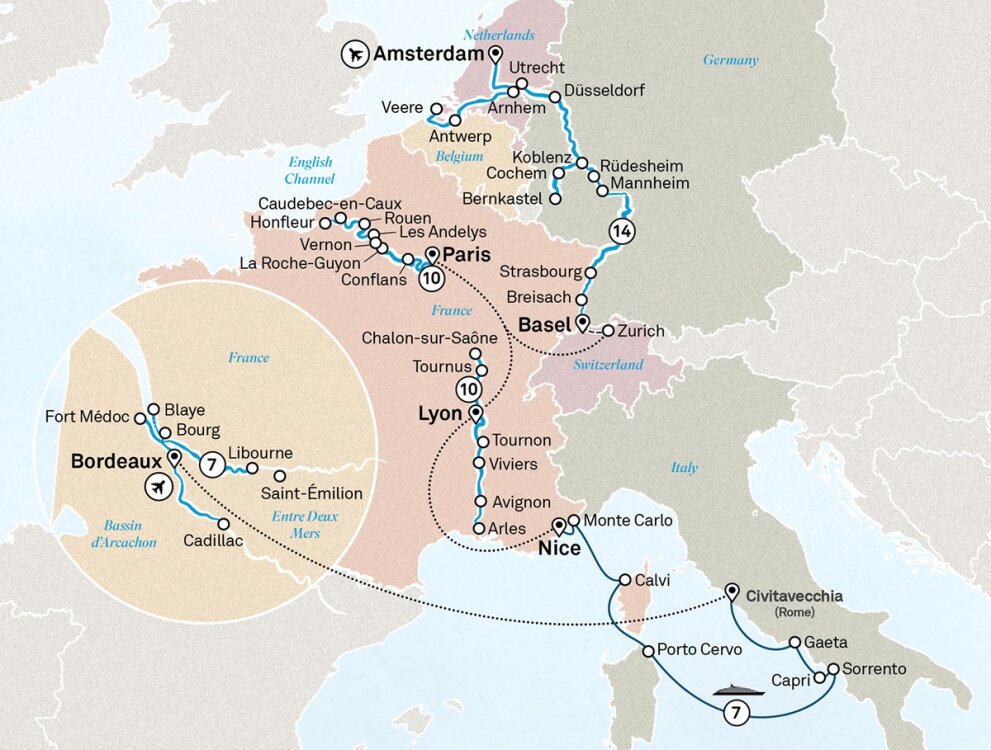 Today join an included flight to Rome, where you will board the Scenic Eclipse for a 7 night journey to Nice.