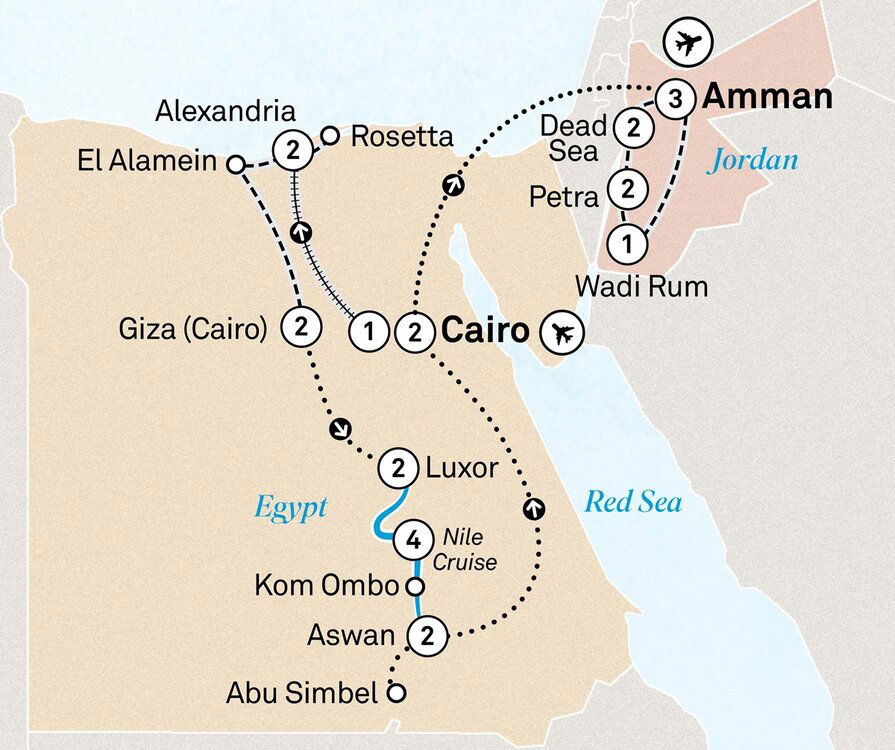 Explore the historic battleground of El Alamein, the site of one of World War II’s defining battles. Visit the El Alamein War Museum, which houses extensive exhibits on the battle, and pay your respects at the Commonwealth Cemetery, a solemn tribute to the soldiers who fought there. Continue to Giza and enjoy a two-night Special Stay at your iconic hotel, offering stunning views of the Pyramids of Giza.