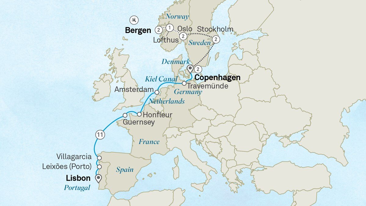 Welcome to Lisbon, Portugal's coastal capital where you can walk along mosaic streets, visit ancient ruins and white-domed cathedrals and feast on Portuguese tarts. Savour one last breakfast on your Discovery Yacht before saying farewell to the crew and your fellow guests as you take memories from your Scandinavia to the Iberian Peninsula voyage.