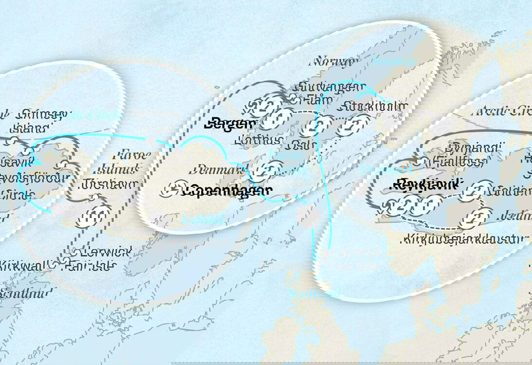 This afternoon you'll arrive at Tórshavn. Named after the Norse god Thor, this is one of the world's smallest capital cities in one of Europe's least travelled destinations. The Faroe Islands offer a captivating blend of Scandinavian culture and breathtaking natural beauty. Wander down cobbled alleyways between colourful buildings with grassy roofs and imagine life in Viking times. Towering cliffs, craggy fjords and powerful waterfalls create a wild landscape. (B/L/D)