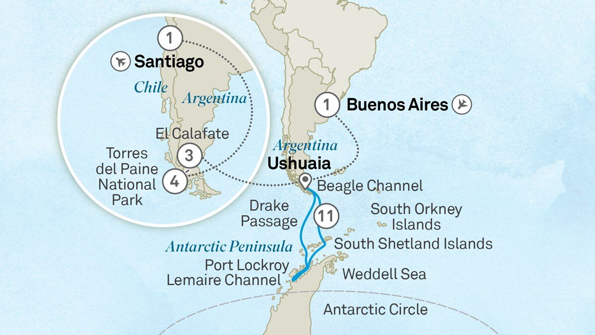 Depart Buenos Aires on an exclusive charter flight to Ushuaia the gateway to Antarctica and the world’s southernmost city, nestled on the rugged shores of Tierra del Fuego. The Captain and crew will warmly greet you as you board your ultra-luxury Discovery Yacht.