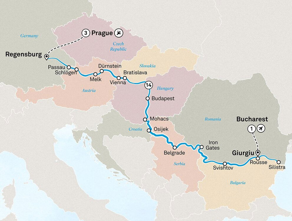 Today you'll cruise through the spectacular scenery of the Djerdap Gorge system, or Iron Gates. This stretch of the Danube is the natural border between Serbia and Romania, and features four narrow gorges, soaring cliffs and the mighty rock carving of Decebalus, the former Romanian king.
