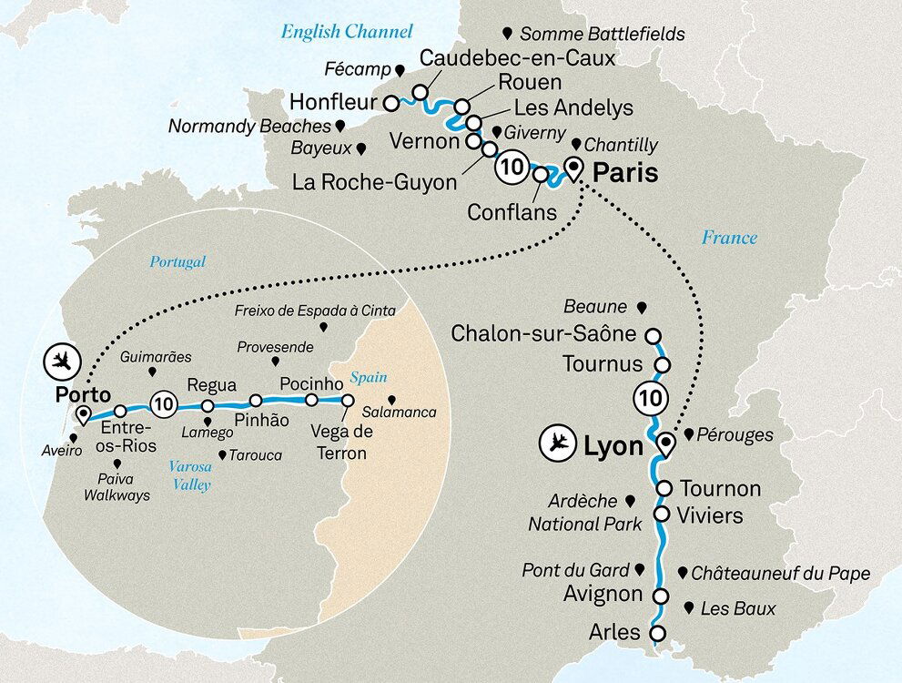 Take your included flight from Porto to Paris where you'll cruise out of Paris with the beautiful city as a backdrop. (B/D)