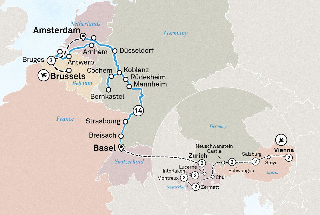 Afterwards, continue to Lucerne, a charming city nestled at the foot of the Alps and on the shore of its namesake lake. After an orientation tour enjoy some time at leisure to explore the delightful Old Town. Your final leg of the journey is to Zurich, the heart of Switzerland. Framed by alpine mountains at the confluence of Lake Zurich and the Limmat River, this scenery-rich city is known for the extraordinary quality of life it offers to its citizens. It’s also Switzerland’s largest city, and its commercial and cultural centre. (B/D)