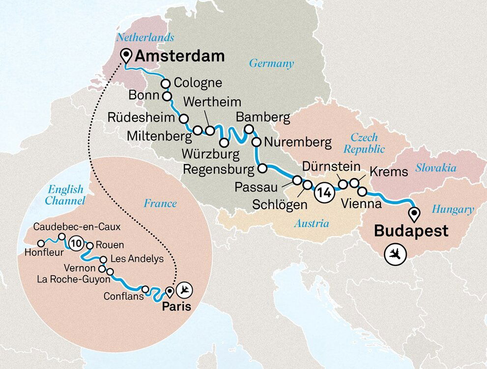 Today board an included flight from Paris to Amsterdam. On arrival you will board your luxurious Scenic Space-Ship where you will spend the next 14 nights cruising the Rhine, Main and Danube rivers to Budapest. (B/D)