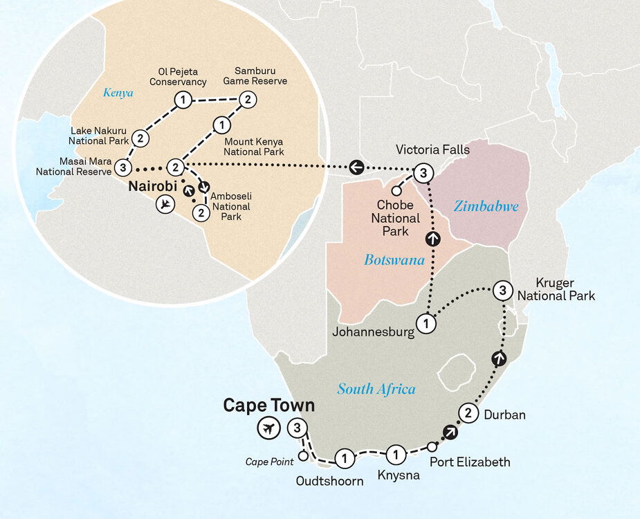 Transfer to the airstrip for your flight to Nairobi. Upon arrival, you will be transferred to Jomo Kenyatta International Airport for your home-bound flight, bringing home memories to last a lifetime.