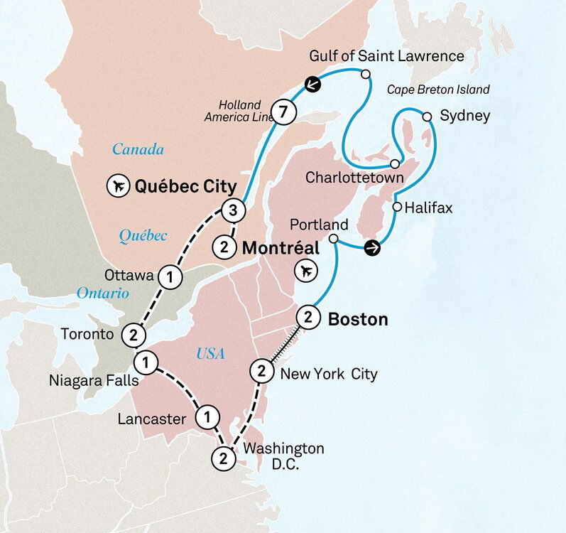 Welcome to Eastern Canada. Your journey begins in Montréal, a striking union of European charm and North American attitude, Montréal seduces visitors with a harmonious pairing of the historic and the new. Enjoy a two-night stay at the luxurious Fairmont The Queen Elizabeth.