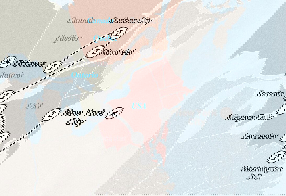 Welcome to Eastern Canada. Your journey begins in the elegant capital city of Ottawa, nestled along the Rideau Canal. Enjoy a two-night stay at the majestic Fairmont Château Laurier, located just steps away from Parliament Hill, and get ready to embark on an unforgettable journey through Canada and the USA's captivating history and culture.