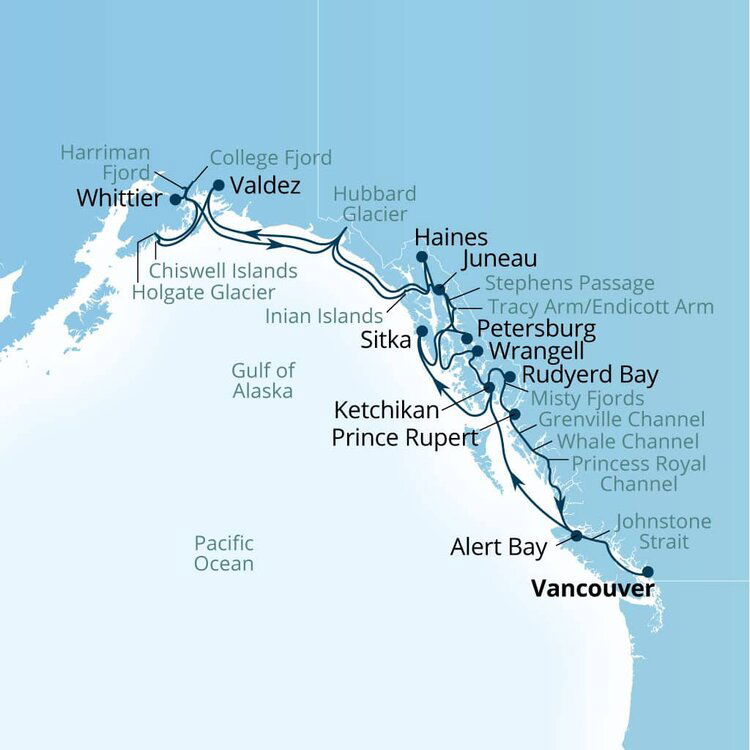 In the passage between Sumner Strait and Clarence Strait in Southeast Alaska’s Alexander Archipelago, midway between Price of Wales Island on the west and Zarembo Island on the east, is a small cluster of islands with a picturesque passageway between them called Snow Pass. It makes a scenic up-close route for your Seabourn ship during the transit.