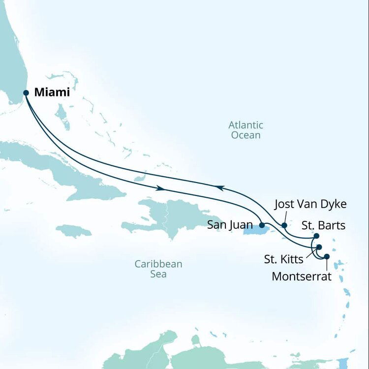 The British Virgin Island’s smallest island, Jost Van Dyke, runs deep with rugged scenery and colourful folklore. The island offers glowing turquoise waters, lazily bowing palm trees, and pristine white sand beaches. Ships will anchor offshore and tenders will be provided to the shore.