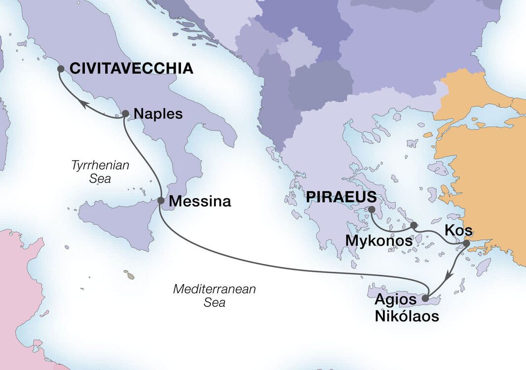 Set on the east of the Greek island Crete, Agios Nikolaos seamlessly blends the charm of a small fishing village with the glamour of a chic resort town. Pastel-coloured houses surround the towns pretty harbour and inky lake, while busy restaurants and cafes spill out onto its lively waterfront. Ships will dock at this port.