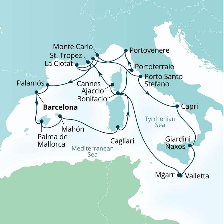 Your cruise finishes today in Barcelona, a captivating city on Spain's northeastern coast. If you're extending your stay in the city, start with a visit to La Sagrada Família, Antoni Gaudí's masterpiece, then wander through the narrow, historic streets of the Gothic Quarter.