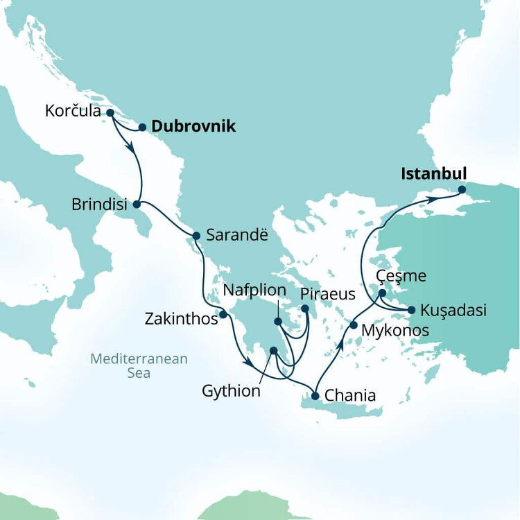 Cruise into Cesme, a charming coastal town on the Aegean Sea. The port is conveniently located near the city's centre, and within walking distance, cruisers will find a range of amenities, including shops, cafes, and local markets.